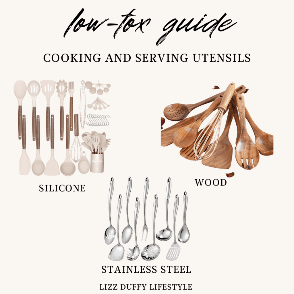Next up are the cooking and serving utensils. You want to avoid plastic due to the nature of them melting at high temps and also leaking chemicals like BPA, PTFE, and Phthalates that will get into your food and cause hormone, nerve, and immunity imbalances over time.