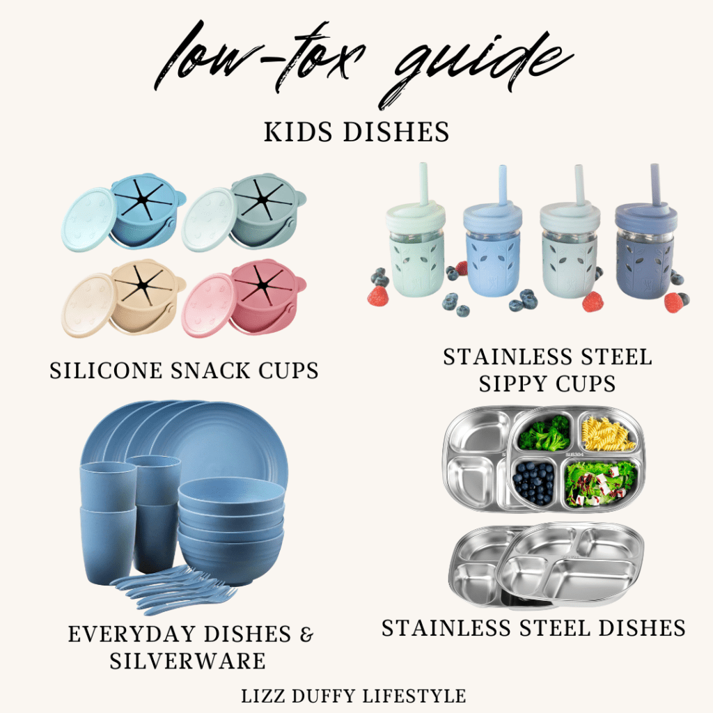 Kids dishes were the hardest to find but also had the least amount of options. With 4 kids and the youngest being a toddler, we don’t really use to-go cups anymore BUT our friends gifted these to our toddler and we absolutely loved them! Silicone snack cups, stainless steel sippy cups, and these are our go-to dishes for our kids ages 2-9. We have not purchased , but have heard from friends that these stainless steel plates are awesome as well!