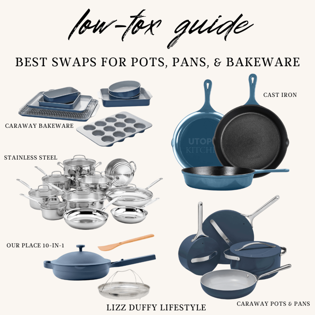 The best are stainless steel, cast iron, Our Place, and Caraway pots and pans and bakeware.